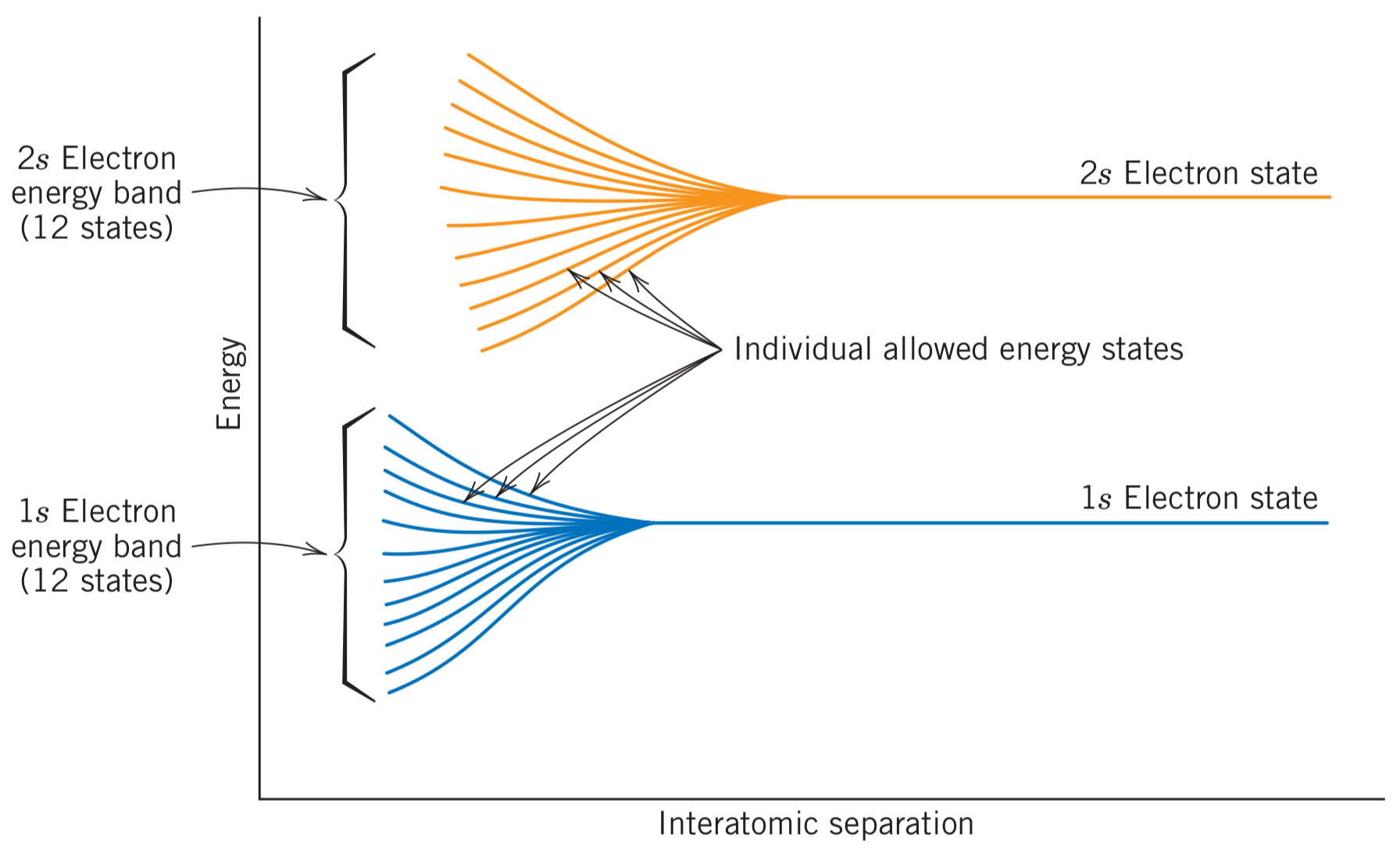 - When atoms get closer, the energy levels get perturbed and splits into multiple energy states. A series of energy states form an energy band.